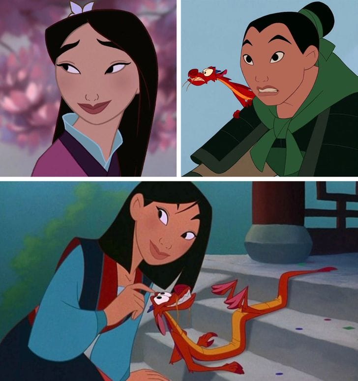 Toward the start of the film, Mulan had long eyelashes. At the point when she claimed to take care of business, her long eyelashes vanished and when she behaves like a lady, she gets her huge eyelashes once more.