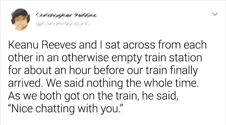 “A family friend builds movie sets, doesn’t design, but is one of the poor dudes that just builds. Anyway, he worked on the set for The Matrix and Keanu heard about the family trouble he was having and gave him a $20,000 Christmas bonus to help him out. He was also one of the only people on the set that genuinely wanted to know people’s names, that would say hello and mean it, and that would talk to people like they were his peers and not below him, just because they were practically making nothing to build a set.” Amazing, right?