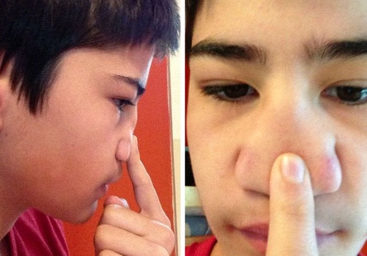 This kid was born without a bridge in his nose. This looks really distinctive having a flexible nose.