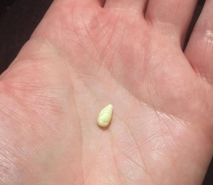 This looks more like an orange seed he forgot to throw out of his mouth and now it got stuck in his mouth.