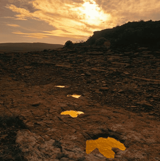 These footprints are the traces of dinosaurs living in the first half of the Cretaceous period, El Chocón, Argentina. Those are huge puddles!