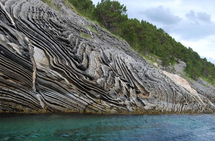 These are migmatites rocks, which are represented by a mixture of igneous and relic rocks. In simple words, this view of a rock looks like a layered cake of magma surrounded by everything by its side.