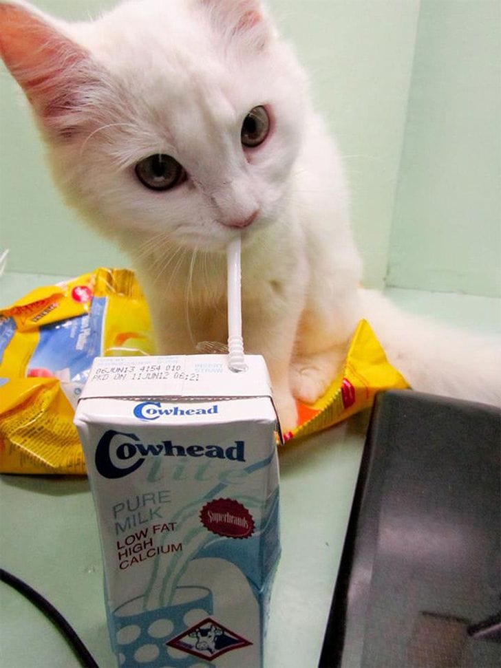 When you got no options left you have to figure things out by yourself, take this cat for an example, this sweet cat knew there are much ways to drink milk than just licking it. This cat is smart and adorable.