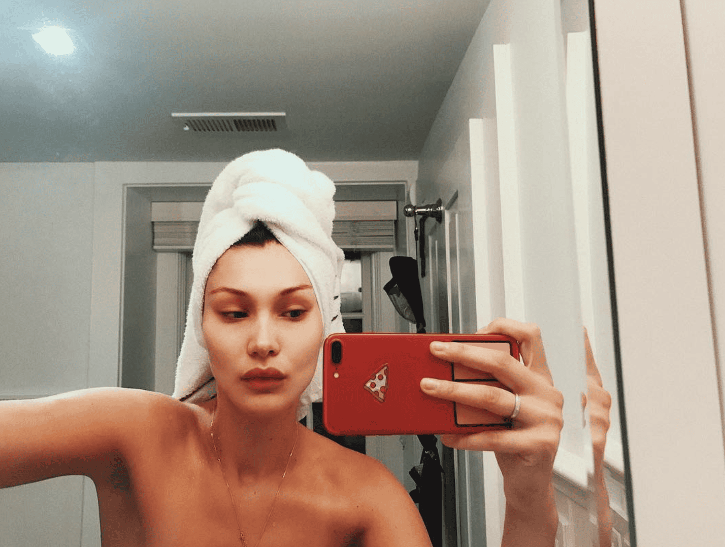 Bella Hadid is an American model and have even voted the 'model of the year'. Even after being so much fame, we often wonder that models don't go out without makeup. But Bella recently posted a picture of her bathroom selfie, in which she posed without makeup.