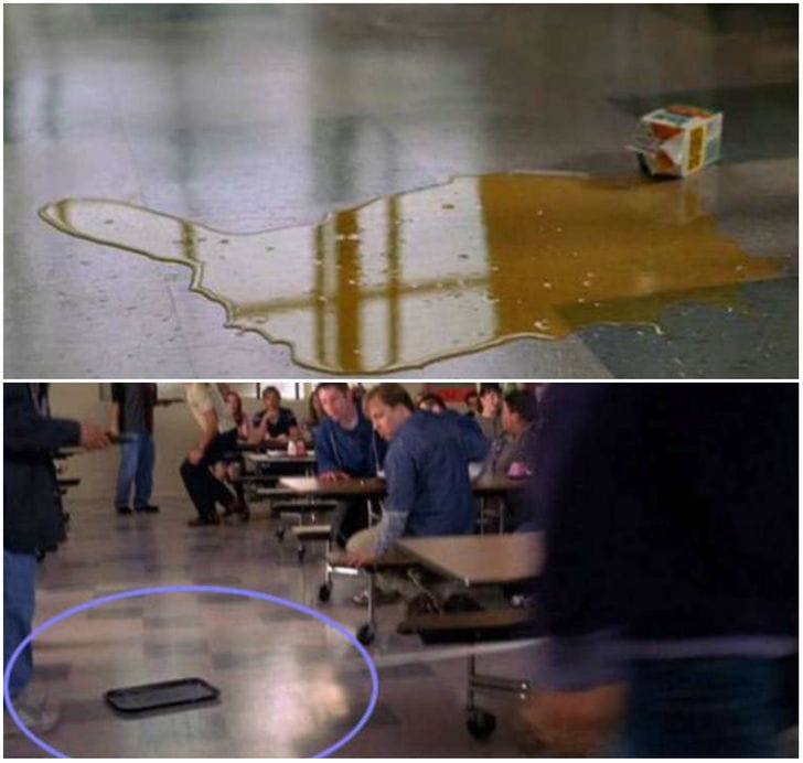 Spiderman had a massive blunder too. In this scene, Mary Jane slips on some spilled juice, but in the next frame the spill is gone. Self-cleaning floors it seems?