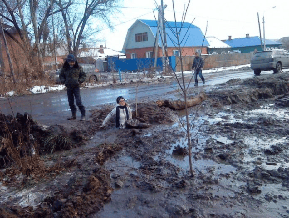 If she fell there while walking on the road, she is stupid. But if it was her choice to fall in the mud just for a little fun, she's still stupid. But thank god, we got more stupidity from people on the internet.