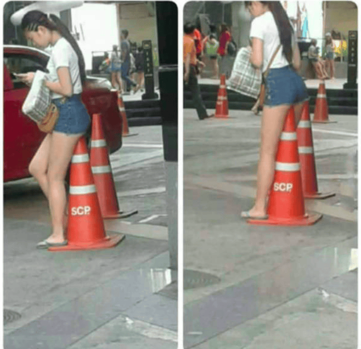 This is so weird, why would she try to sit on the cone, in public? Or maybe why would she try to sit on it at all? She must be insane to perform such stunt.