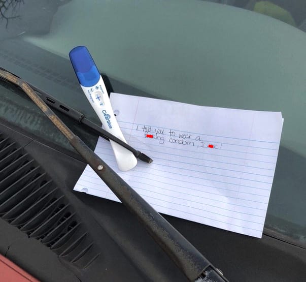 Okay this woman took it a tad bit to heart. Clearly she was not happy with the news this little stick gave her so guess what she decided to do? Umm, make a note and stick on his windshield. Better not mess with this one!