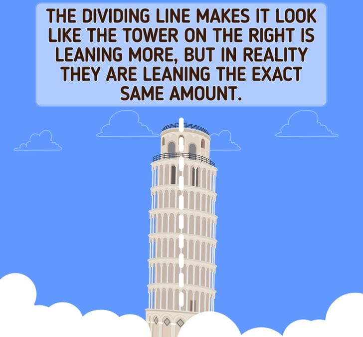 Neither of them are leaning more than the other. This simply means - they are exactly the same! Well turns out, the dividing line tends to confuse the human eye and even when there is no real difference, it does seem like the tower on the right is leaning a little more